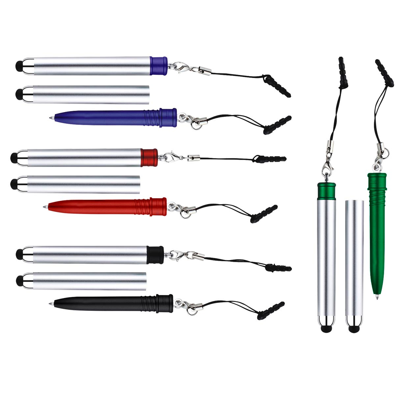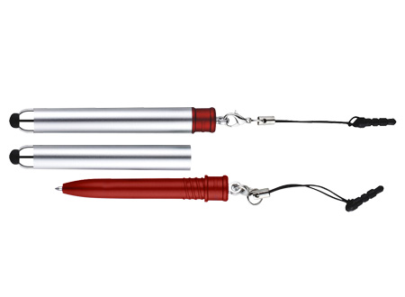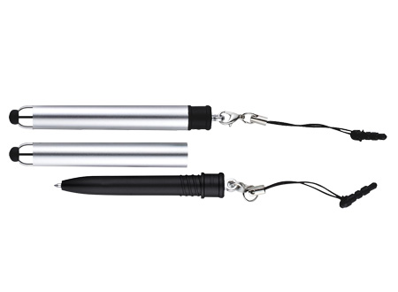Bolígrafo «Touch-Screen» con tapa plateada y goma posterior negra para pantalla táctil. Incluye práctico soporte plástico para insertar en la salida de auricular del iPhone. Escritura azul.
