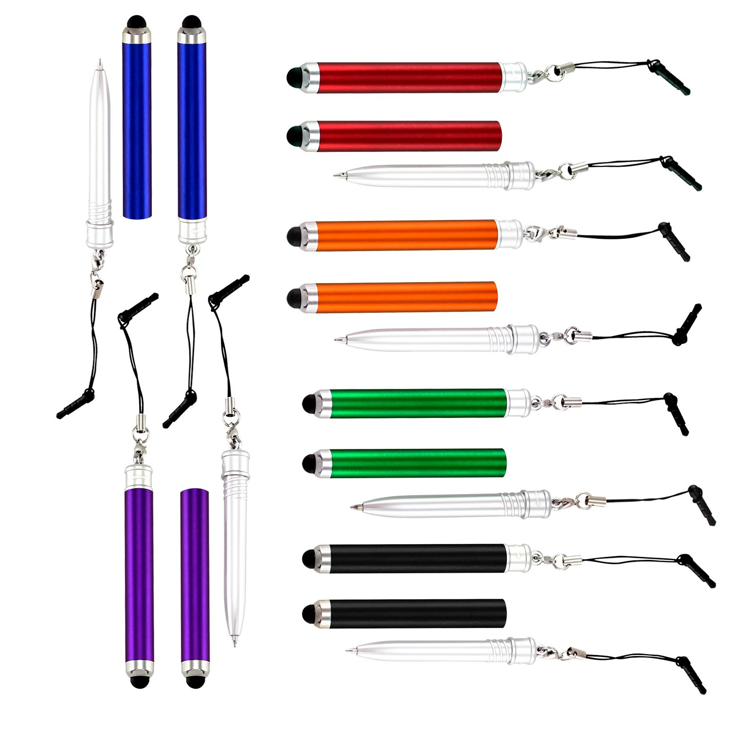 Bolígrafo «Touch-Screen» con cuerpo plateado, tapa de color metalizado y goma posterior negra para pantalla táctil. Incluye práctico soporte plástico para insertar en la salida de auricular del iPhone. Escritura azul.